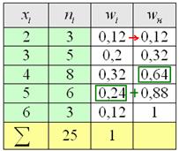 Накопленные относительные частоты удобно записывать в отдельный столбец таблицы, при этом алгоритм вычислений очень прост: сначала сносим слева 1-е значение (красная стрелка), а каждое следующее получаем как сумму предыдущего и относительной частоты из текущего левого столбца (зелёные обозначения):
