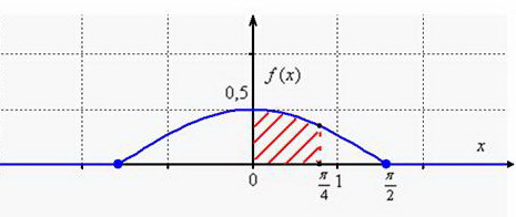 Значение численно равно заштрихованной площади – это я специально сделал, чтобы напомнить вероятностный смысл функции плотности. И вся площадь под «дугой» равна единице, то есть, достоверным является тот факт, что случайная величина примет значение из интервала . Заметьте, что значения , согласно условию, невозможны.